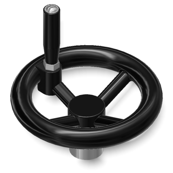 Il volantino a 4 razze con maniglia girevole è un componente meccanico progettato per il controllo manuale di macchinari e attrezzature in vari settori industriali. Il corpo è realizzato in tecnopolimero rinforzato di colore nero, conferendo elevata resistenza a solventi, oli, grassi e altri agenti chimici, garantendo durabilità nel tempo. La parte metallica include una boccola in ottone con foro cieco filettato, che consente un fissaggio stabile e sicuro. Questo volantino è indicato per resistere a temperature di esercizio fino a 150°C.