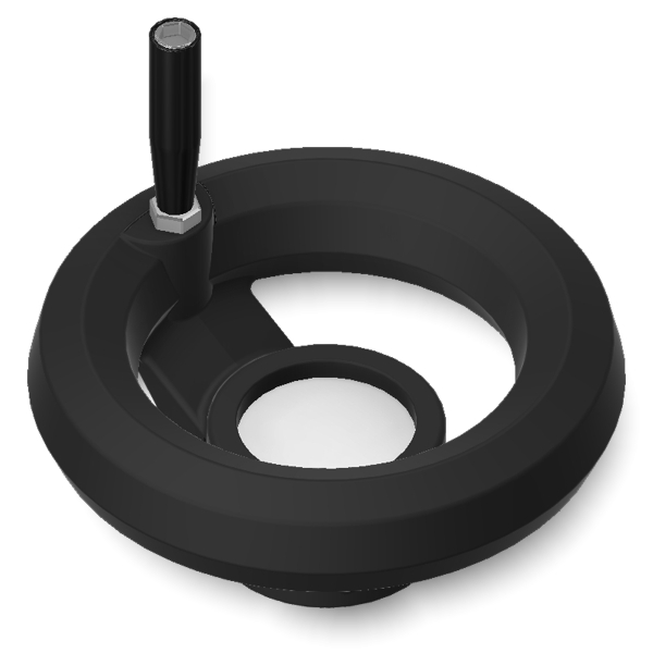 Il volantino a fascia con impugnatura girevole è un componente meccanico progettato per il controllo manuale di macchinari e attrezzature in vari settori industriali. Il corpo è realizzato in tecnopolimero rinforzato di colore nero, conferendo elevata resistenza a solventi, oli, grassi e altri agenti chimici, garantendo durabilità nel tempo. La parte metallica include una boccola in ottone con foro cieco filettato, che consente un fissaggio stabile e sicuro. Questo volantino è indicato per resistere a temperature di esercizio fino a 150°C.